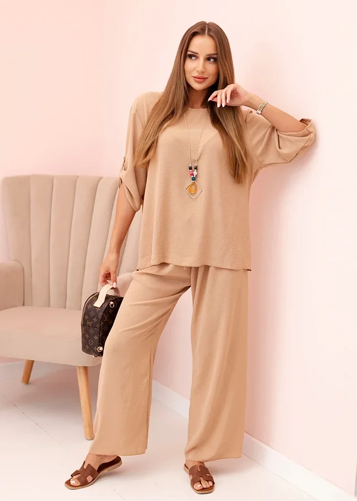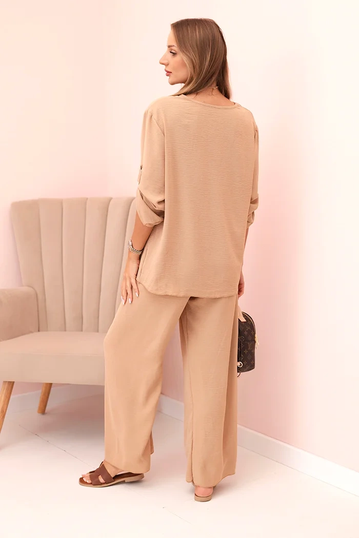 Atraskite nepriekaištingą harmoniją tarp stiliaus ir patogumo su šiuo elegantišku smėlio atspalvio kostiumu. Pagamintas iš lengvo, malonaus audinio, šis dviejų dalių derinys – laisvo kirpimo palaidinė su dekoratyviniu vėriniu ir plačios kelnės – suteikia judėjimo laisvę bei lengvumo pojūtį.