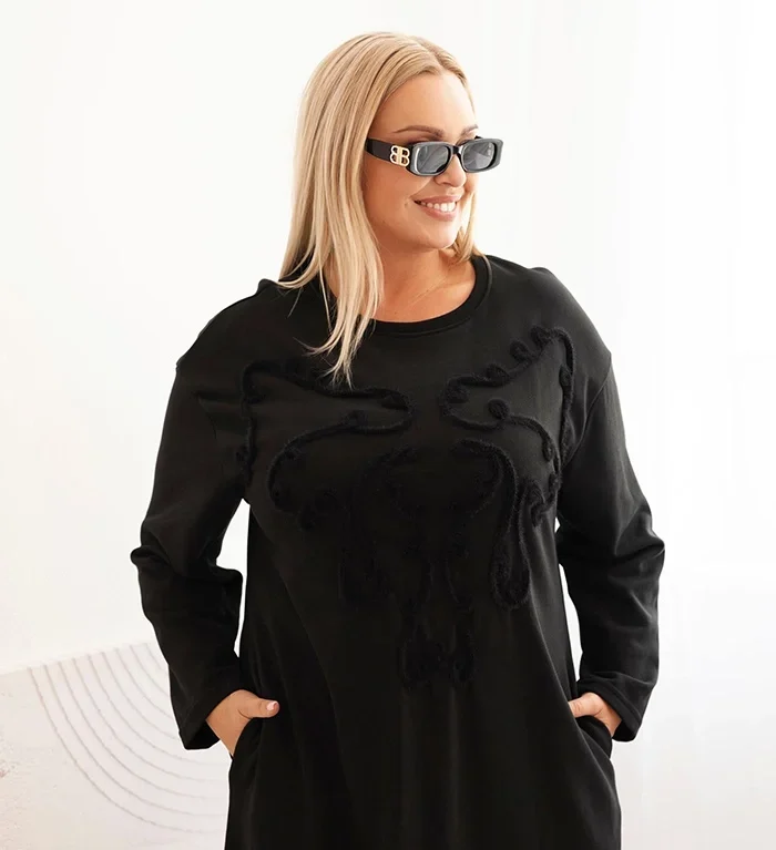 Ši itališko dizaino juoda suknelė pagaminta iš švelnios, kvėpuojančios medvilnės – ji maloniai priglunda prie kūno ir leidžia jaustis patogiai visą dieną. Subtilus, pūkuoto efekto siuvinėjimas ant krūtinės suteikia išskirtinumo ir prabangos pojūtį, o klasikinė juoda spalva išlieka amžinai madinga.